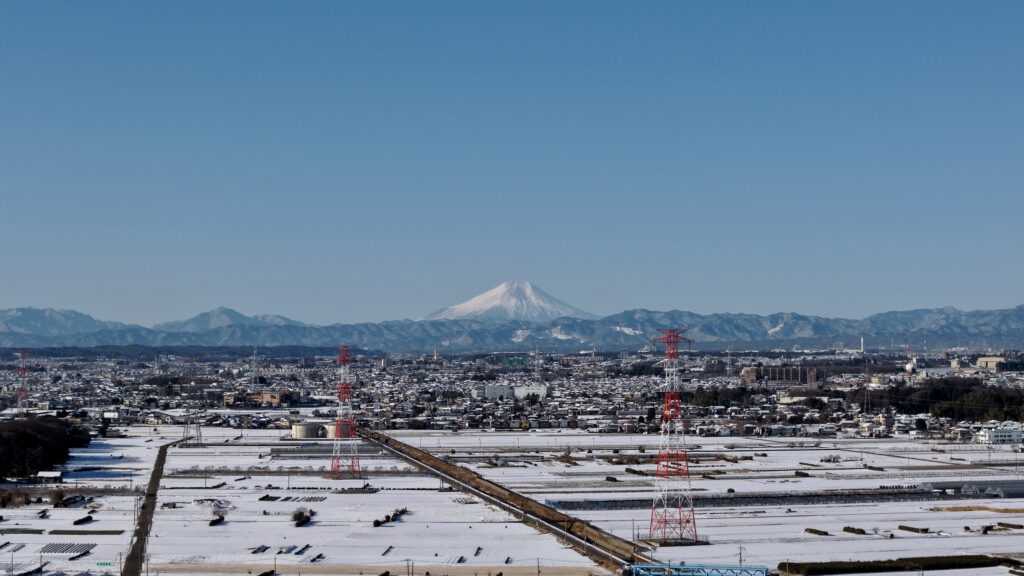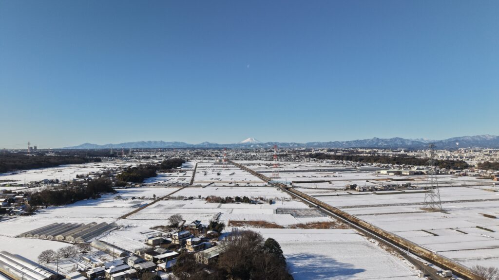 川越の雪景色2026年2月10日2026年2月10日 雪が降った翌日 ドローン事業部上空から富士山を入れて雪景色を撮影しました。 ・24mm(35mm換算) 富士山とその上に月 ・70mm(3倍) レンズを中望遠に切り替えても富士山がきれいに撮れてる。 ・ドローンのデジタルズームで6倍 ・そして9倍 もう、川越感は無いです。 ドローンだけでこれだけ撮れるの凄くない? DJI AIR 3S(ND32)
